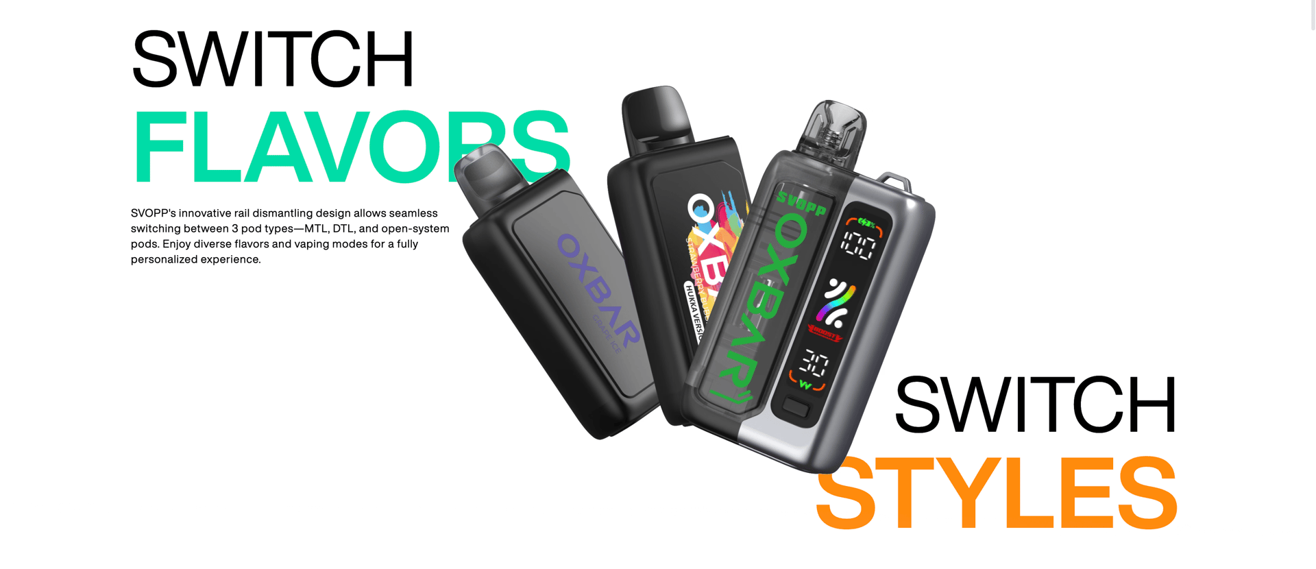 جهاز Oxbar SVOPP Pod 27K هو نظام فيب هجين يجمع بين ميزات الأجهزة القابلة للتبديل والراحة التي تقدّمها الأجهزة القابلة للاستخدام مرة واحدة. يتميّز بتصميم مدمج يسمح بفصل الوحدة التي تحتوي السائل (Pod) عن البطارية لإعادة الاستخدام، مع إمكانيات ضبط الطاقة وتدفق الهواء ليتناسب مع أسلوب السحب المفضل لديك.