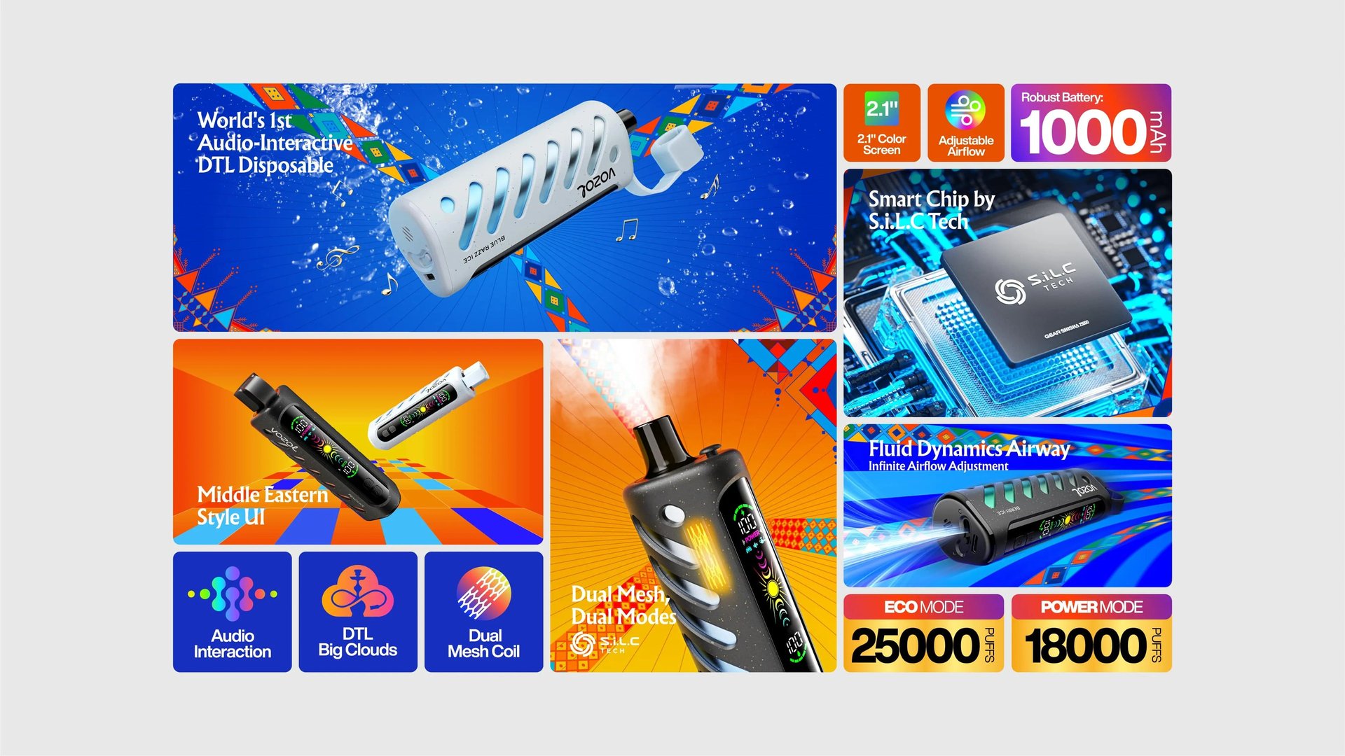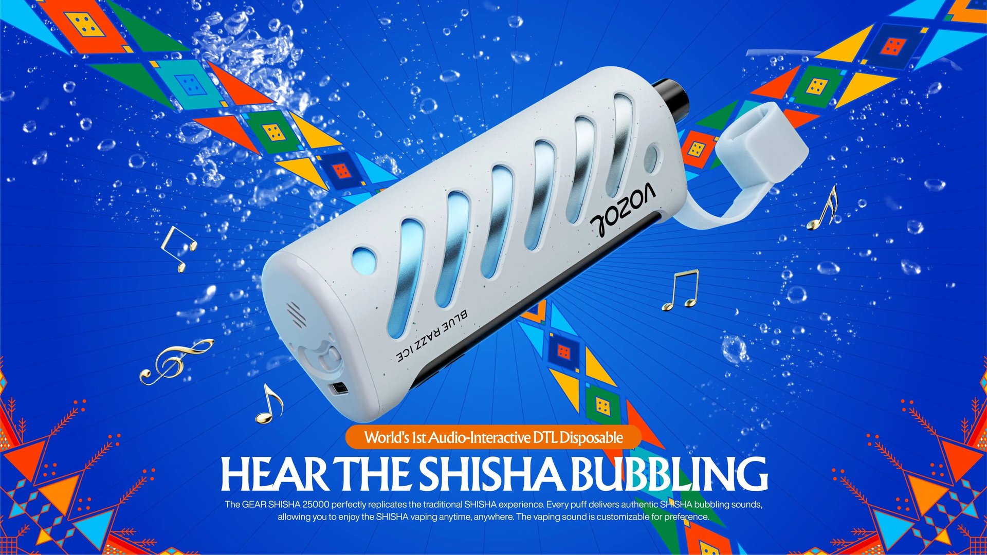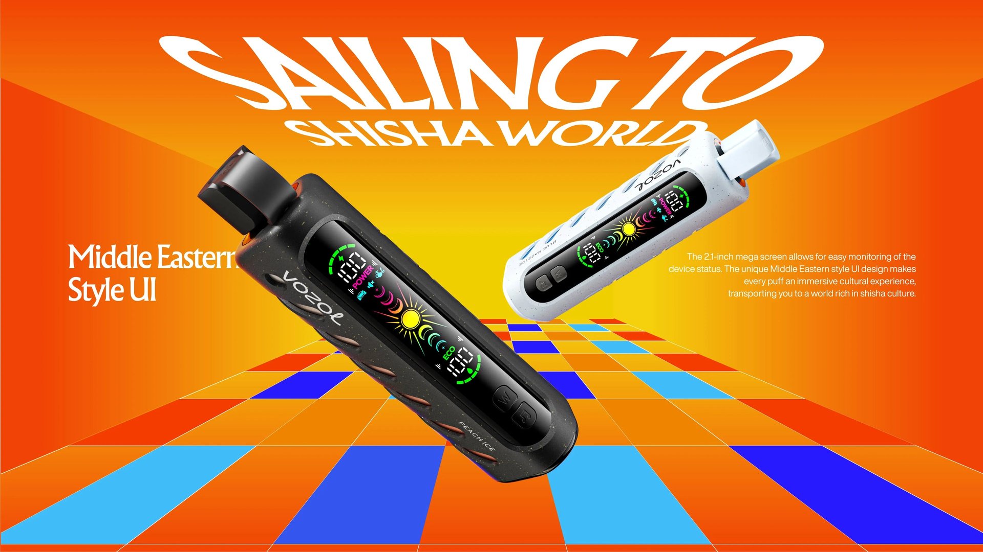 شيشة إلكترونية بتصميم شرقي، تعمل بتقنية اللفّتين المزدوجتين وتفاعل صوتي ذكي، توفر حتى 25,000 سحبة ببطارية قابلة للشحن ونكهات متعددة.